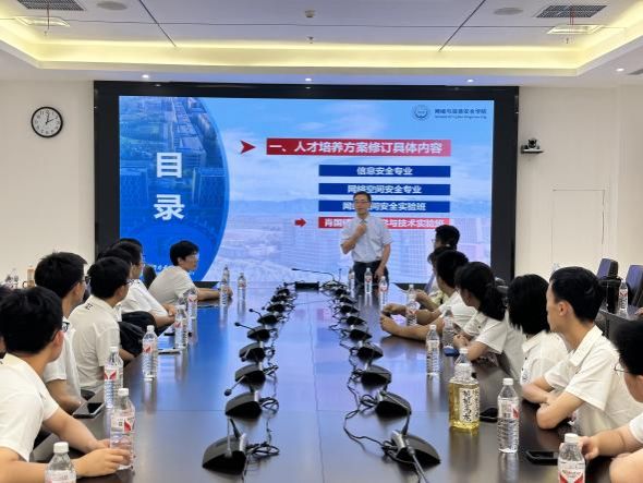 2418039班(网络空间安全实验班)班主任刘德成老师介绍了个人科研方向与科研项目,通过引用潘云鹤院士三元空间理论说明了网络空间安全这门学科在当今时代的重要性。他还鼓励本科生积极参与到科研实习中,希望同学们积极探索个人发展方向,欢迎大家就个人生涯规划、学习学业、班级建设等方面积极交流。刘老师与同学们积极互动,现场气氛轻松活跃。