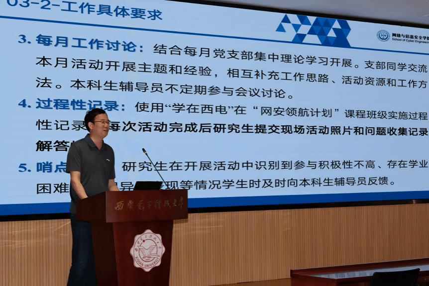 公司研究生兼职辅导员雷泽宇从“网安领航计划”学风提振工作方案的开展背景、活动意义、瞄准问题和工作具体要求等几个方面对工作方案做了具体解读。