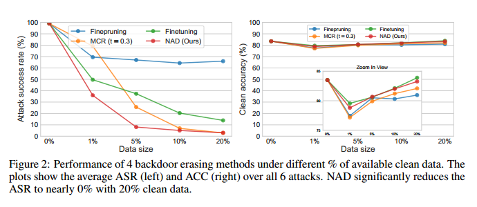 针对这一问题,本文提出了一种新颖的防御框架--神经元注意力蒸馏(Neural Attention Distillation,NAD),以消除DNN中的后门触发器。NAD利用教师网络在少量干净的数据子集上指导后门员工网络的微调,以使员工网络的中间层注意力激活与教师网络的注意力激活保持一致。其中,教师网络可以通过对同一干净子集进行独立的微调获得。针对6种最新的后门攻击——BadNets,Trojan attack,Blend attack,Clean-label attack,Sinusoidal signal attack,Reflection attack,验证了提出的NAD的有效性,仅使用5%的干净训练数据就可以有效擦除后门触发器,同时几乎不影响干净样本的性能。