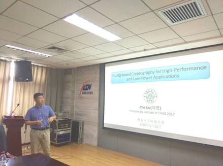 在访问期间,刘哲教授与公司师生进行了学术交流,主要围绕使用FourQ的嵌入式设备上的椭圆曲线标量乘法,椭圆曲线Diffie-Hellman(ECDH)密钥交换和椭圆曲线数字签名的高能效和高安全性实现,并采用有效的对策来阻止各种侧信道攻击的内容。6月26日下午,刘教授于新科技楼609会议室作了一场题为“FourQ-based cryptography for high-performance and low-power applications”的精彩学术报告,报告由陈晓峰教授主持。