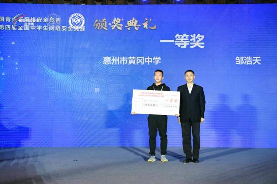 中央网信办网络数据管理局局长胡啸为获得大赛一等奖的邹浩天同学颁奖