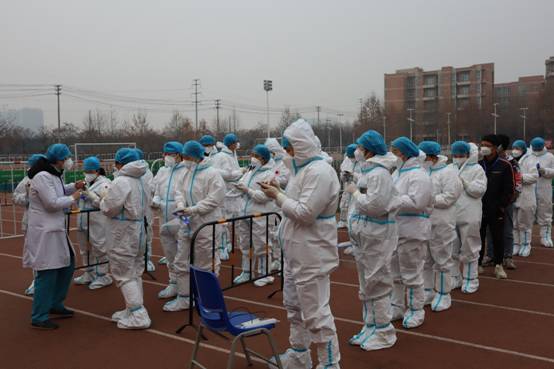 1月4日早晨8点,27名志愿者全部按时到达北操场指定地点进行准备工作。经过医护工作人员的细心培训和指导,志愿者很快进入状态,全副武装投入工作,与医护工作人员默契配合,开始了一天的核酸检测任务。
