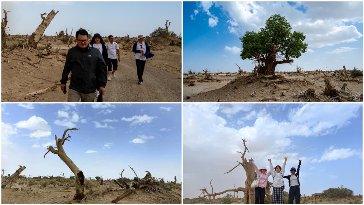 胡杨树生而千年不死、死后千年不倒、倒后千年不朽,坚韧挺拔地生长在极端恶劣的环境下。睡胡杨即“沉睡的胡杨”,胡杨枯死多年,脚踏沙土、头顶烈日,守护着边疆,在茫茫大漠留下不朽的“生命奇观”。实践队员们来到十四团睡胡杨谷,感受胡杨虽死犹生、虽睡犹醒、纵横不断、百折不挠的生命奇迹,学习“艰苦奋斗、自强不息、扎根边疆、甘于奉献”的胡杨精神。“在一片姿态各异的睡胡杨林中,有一棵胡杨长满繁茂的枝叶,屹立不倒。绿色的叶,蓝色的天,周围却是黄色的茫茫的一片,形成的强烈对比让我深刻感受到了那种自强不息、顽强生长的力量。”实践队员陈茵茵说。