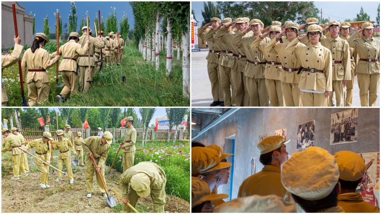 换上服装、拿好农具,实践队员们列队整齐,在“上一堂传统教育课,听一段红色故事,参与一次军垦劳作、吃一顿忆苦思甜饭,学唱一首歌谣”中,体验军垦战士坚持军事训练、投身生产建设的生活场景,感受那个热火朝天、集体劳作、激情燃烧的岁月,深刻领悟“热爱祖国、无私奉献、艰苦创业、开拓进取”的兵团精神。