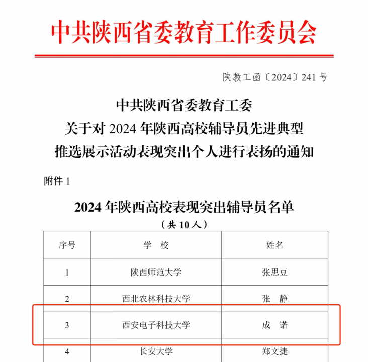近日,陕西省委教育工委组织开展的2024年陕西高校辅导员先进典型推选展示活动结果正式公布,意昂2辅导员成诺以总排名第3的优异成绩荣获“2024年陕西高校表现突出辅导员”,充分展现出公司辅导员良好的精神风貌和过硬的素质能力。