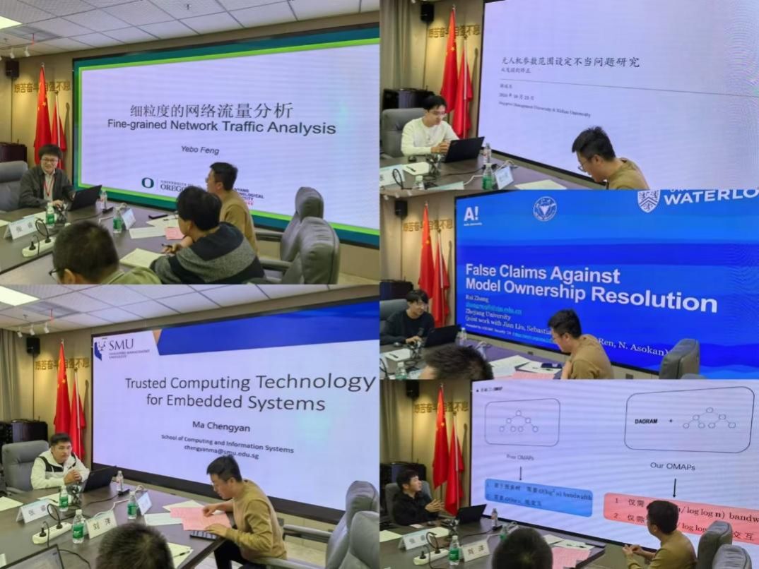 会上,五位优秀青年学者分别进行了精彩的学术报告,就《细粒度的网络流量分析》《面向嵌入式系统的数据安全保护技术》《从发现到矫正:无人机参数范围设定不当的问题研究》《深度神经网络的模型确权问题和模型水印技术的研究》《密态数据库关键技术研究》等主题展开讲座。参会师生围绕报告内容,踊跃提问,双方对相关问题进行深入探讨,思想交锋高潮迭起、精彩纷呈。