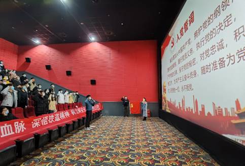 电影开始前,研究生第六党支部的宣传委员洪意阳同志带领全体党员和预备党员重温入党誓词,追忆入党初心,进一步坚定理想信念,领会革命先辈们加入共产党改变中国之危难局面的决心和使命。