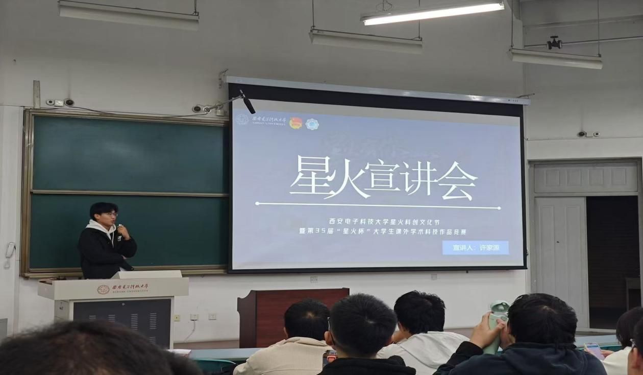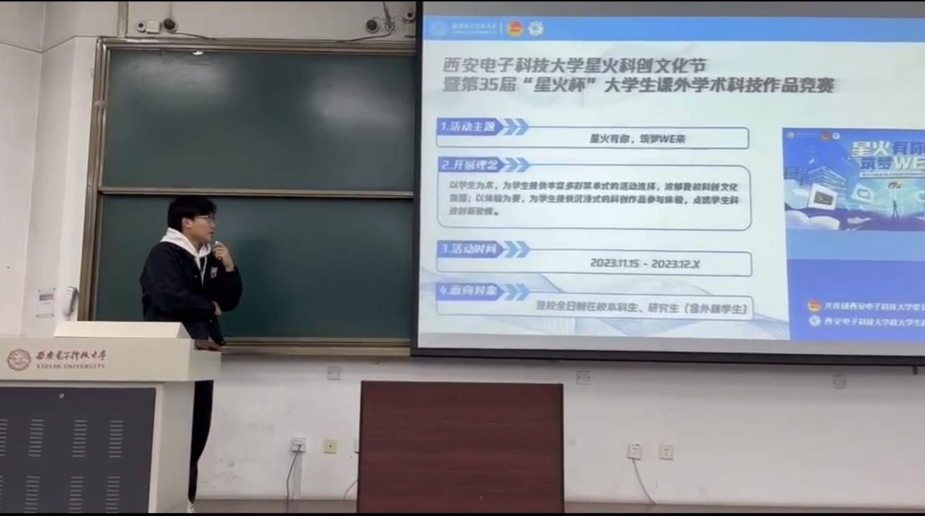 在宣讲的开始阶段,许家源同学首先向同学们详细介绍了星火杯的开展理念以及比赛时间等,帮助大家对这一赛事的基本情况有了初步的了解。紧接着,他深入讲解了星火杯的具体赛制,从主体赛道的各种细化类别讲起,详细地讲述了包括软件类、硬件类、创意类等在内的各类作品的定义和赛道要求,介绍了“数字西电”专项赛道的各种题目并细致地进行专项解读,再到讲解比赛具体的申报要求、大体流程以及时间节点,激起同学们的兴趣,使他们对星火杯有了更加深入的理解,为同学们后续切身参与比赛指引了方向。宣讲的最后环节,许家源同学阐述了星火杯的重要意义,鼓励大家真正参与到比赛当中,并针对同学们提出的疑惑一一进行细致的解答,得到了同学们极其热烈的反响。