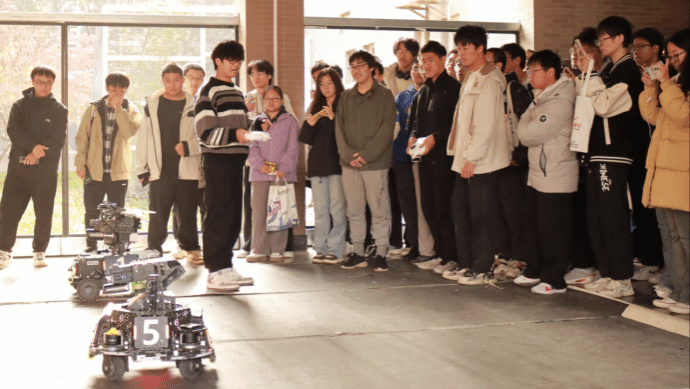 为了帮助同学们更深入了解如何将所学知识应用到实践中,赵老师带同学们参观了IRobot机器人实验室。IRobot机器人战队成员现场还为同学们演示了机器人实战场景,让同学们深刻感受到了科技的魅力。