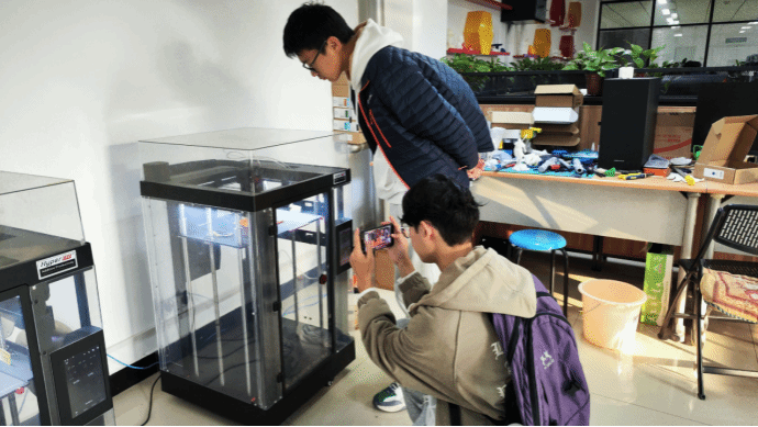 在3D打印实验室,同学们学习了3D打印技术的原理、发展前景、和应用领域,并观看3D打印设备现场打印,同学们对这一前沿技术表现出了极大的兴趣。