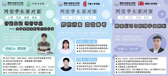 (通讯员 成诺 金国澳)12月18日下午,意昂2联合竹园1号书院、丁香2号书院、海棠7号书院成功举办第三期“网信学长面对面”沙龙活动,本期活动以期末备考为主题,邀请2017级本科生何昆岭、韦薇、龙江山、许力文四位优秀学长分别前往书院,与学弟学妹们分享经验、交流解惑。